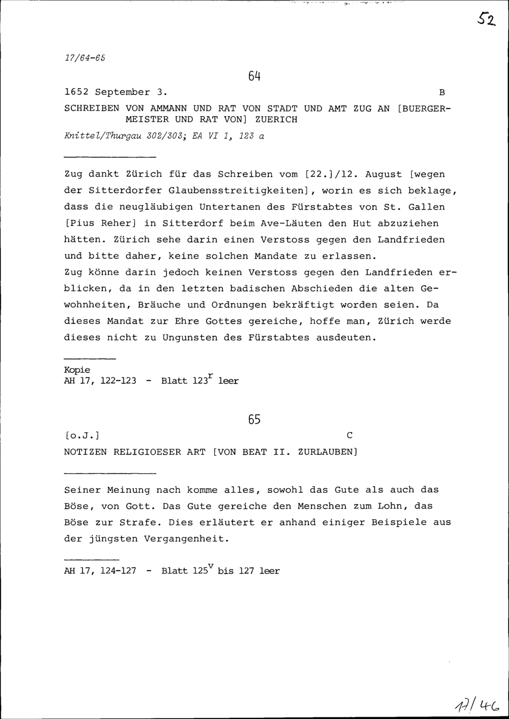 Notiz religiöser Art von Beat II. Zurlauben