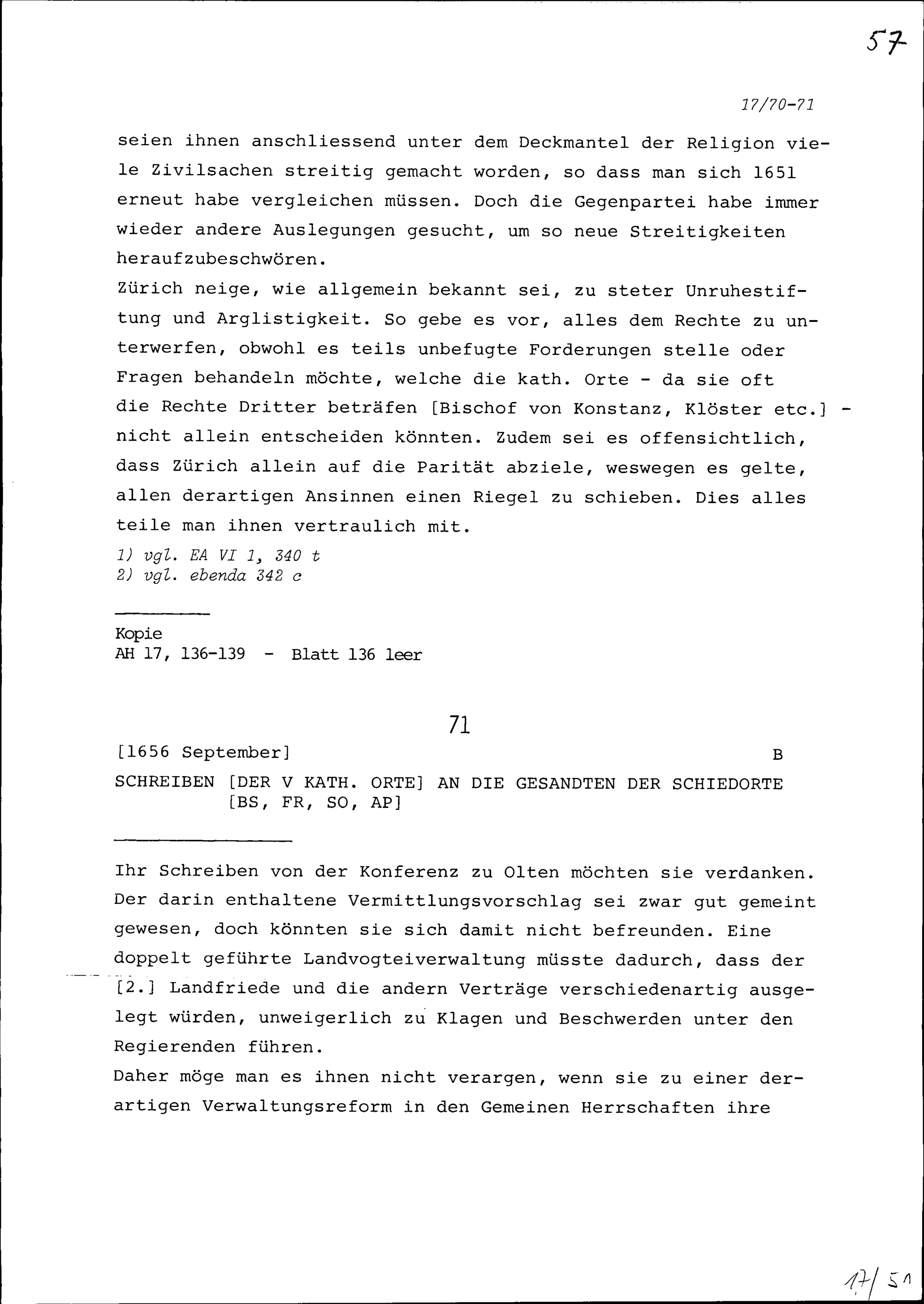 Schreiben der Fünf Katholischen Orte an die Gesandten der Schiedsorte Freiburg und Solothurn