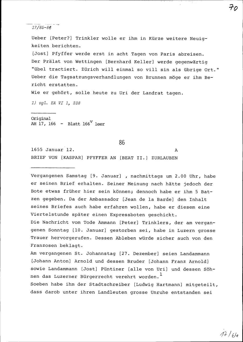 Schreiben von Kaspar Pfyffer an Beat II. Zurlauben