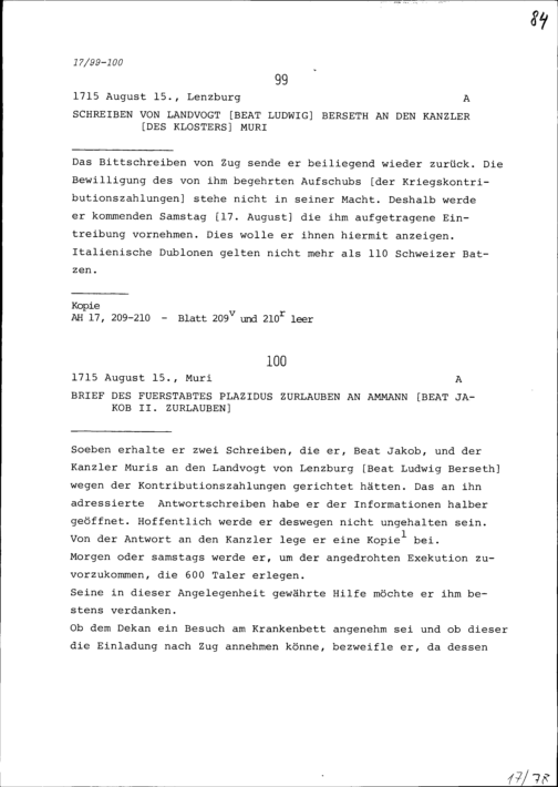 Schreiben von Plazidus Zurlauben, Fürstabt, an Beat Jakob II. Zurlauben, Ammann