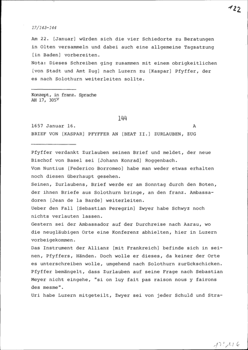 Schreiben von Beat II. Zurlauben an Jean de la Barde, Ambassador von Frankreich