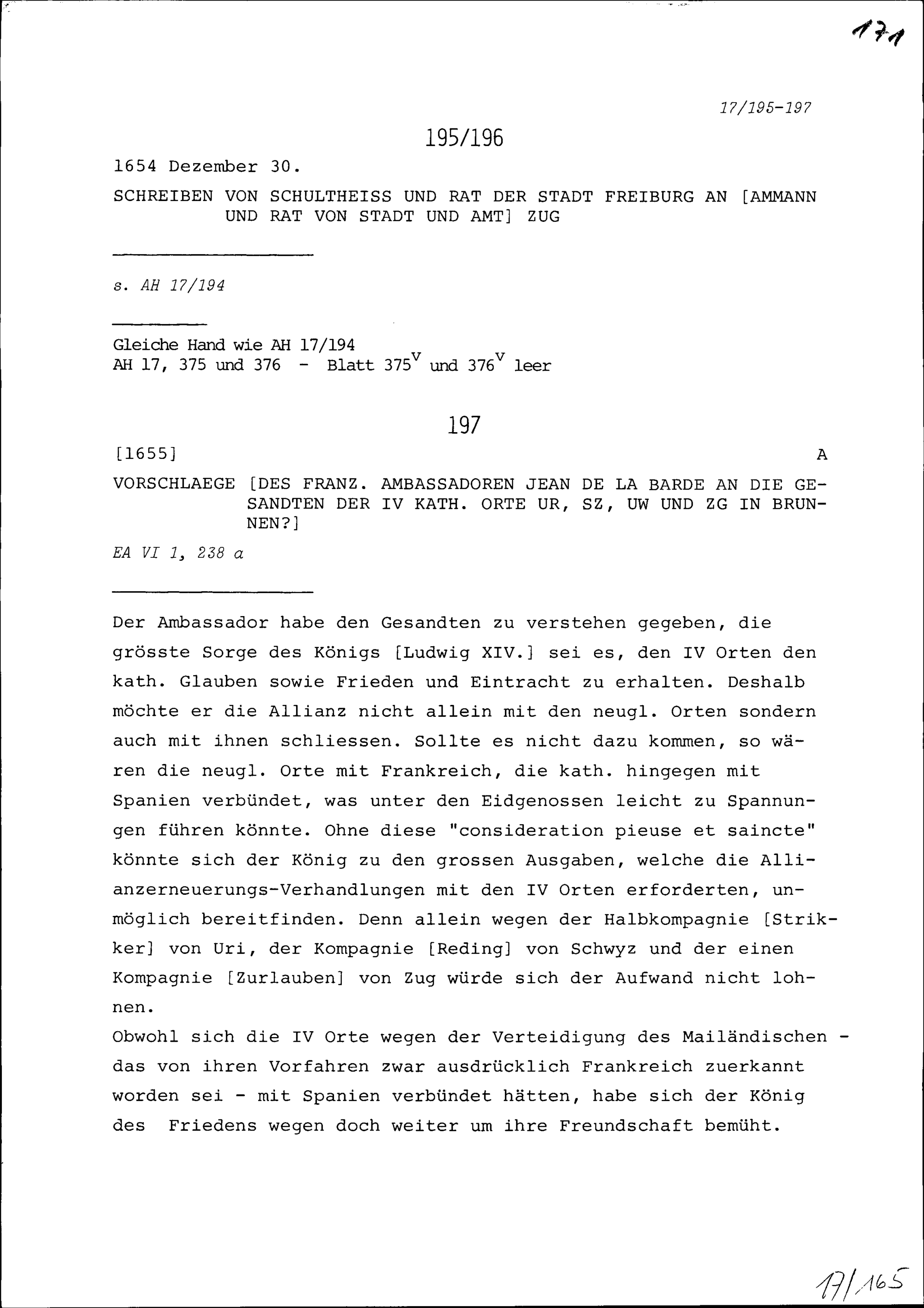 Vorschläge von Jean de la Barde, Ambassador von Frankreich, an die Gesandten der Vier Katholischen Orte Uri, Schwyz, Unterwalden (Ob- und Nidwalden) und Zug in Brunnen