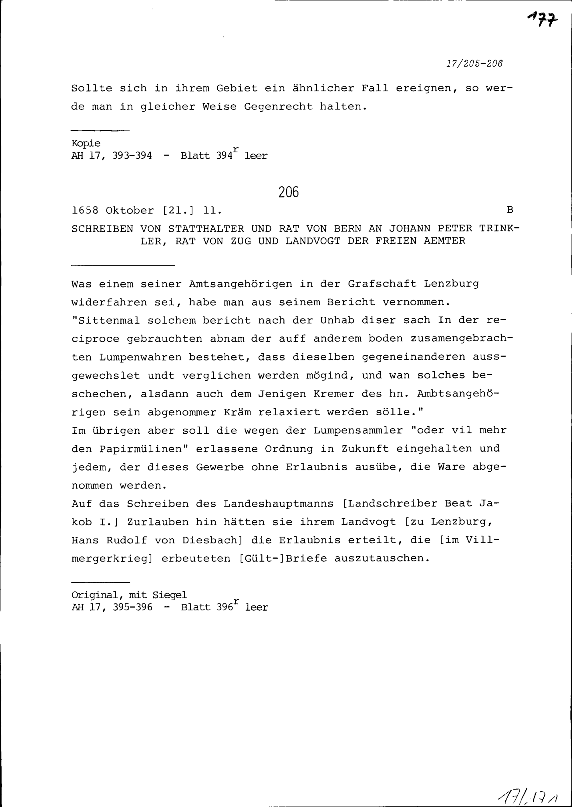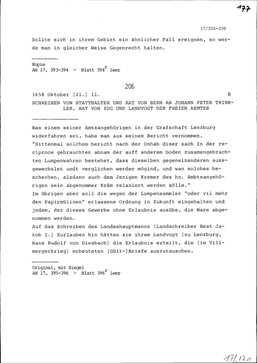 Schreiben von Johann Peter Trinkler, Landvogt der Freien Ämter, an Schultheiss und Rat Bern