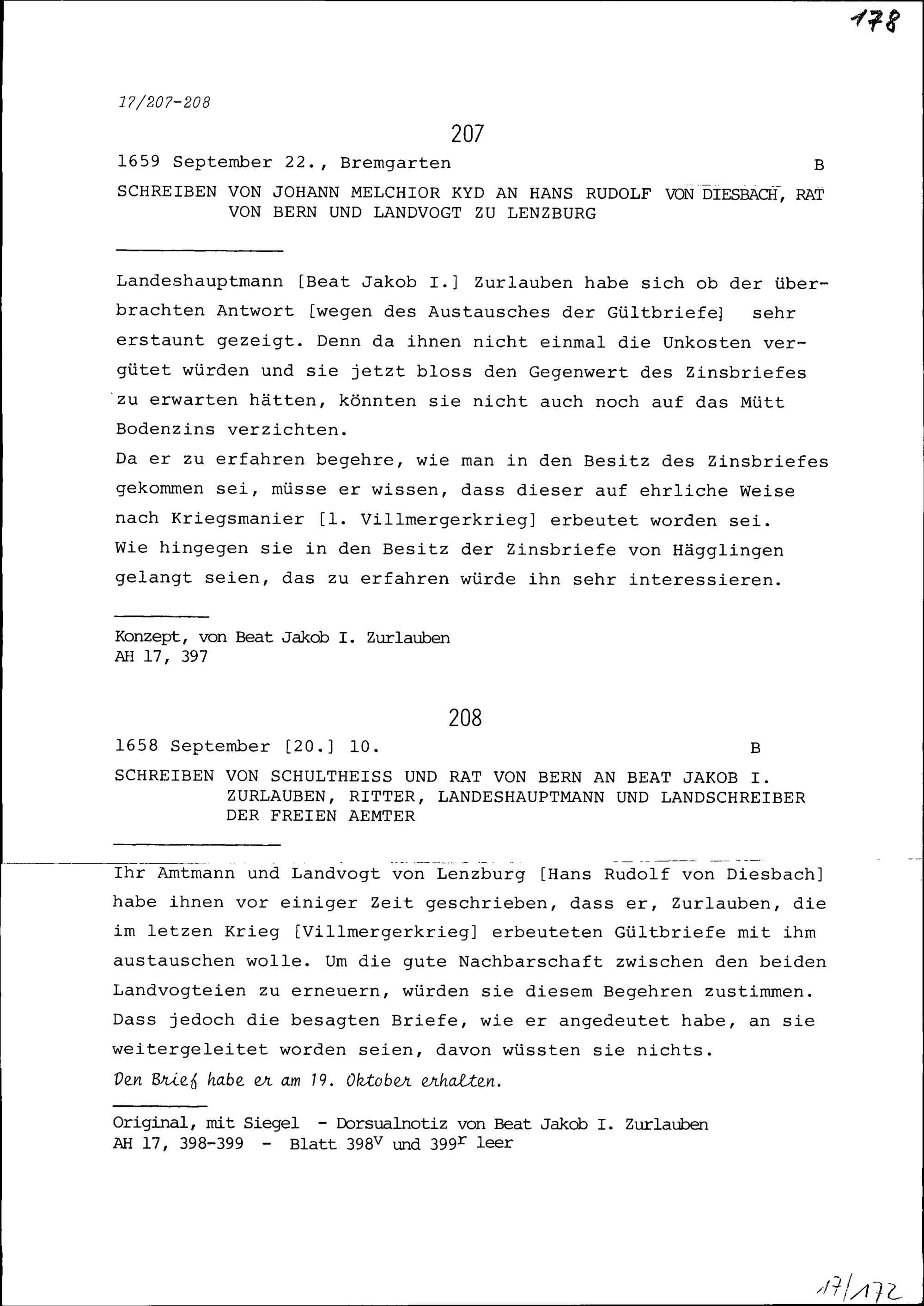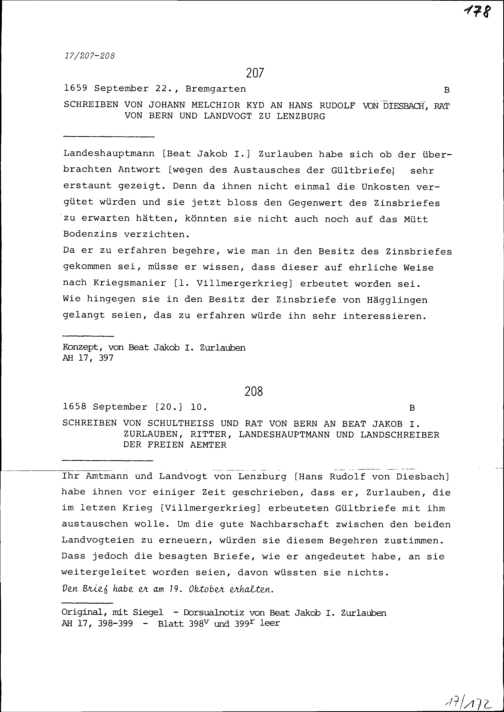 Schreiben des Schultheiss und Rats Bern an Beat Jakob I. Zurlauben, Landeshauptmann und Landschreiber der Freien Ämter