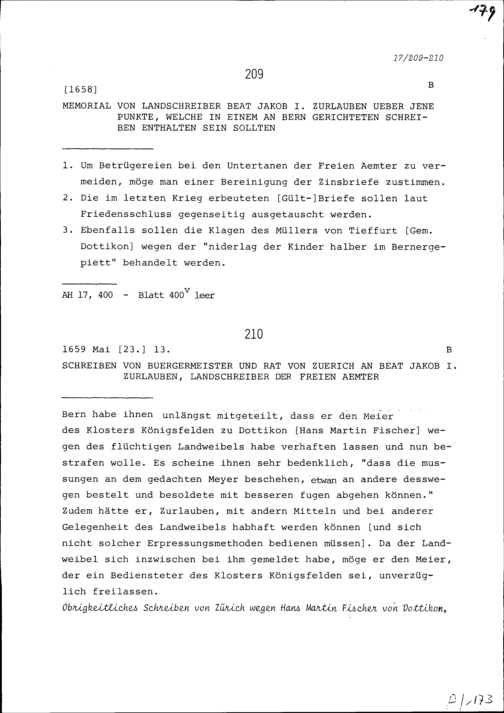 Schreiben des Bürgermeisters und Rats Zürich an Beat Jakob Zurlauben, Landschreiber der Freien Ämter
