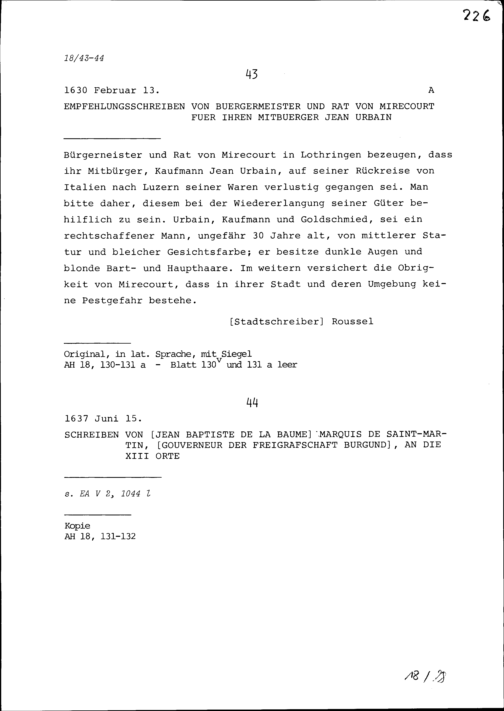 Schreiben von Jean Baptiste de la Baume, Marquis de Saint-Martin-le-Châtel, Gouverneur der Freigrafschaft Burgund, an die Dreizehn Orte