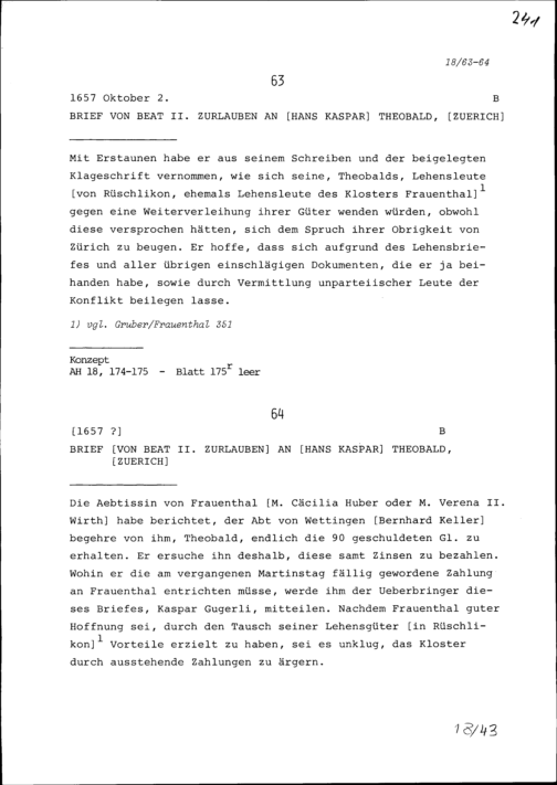 Schreiben von Beat II. Zurlauben an Hans Kaspar Theobald, Zürich