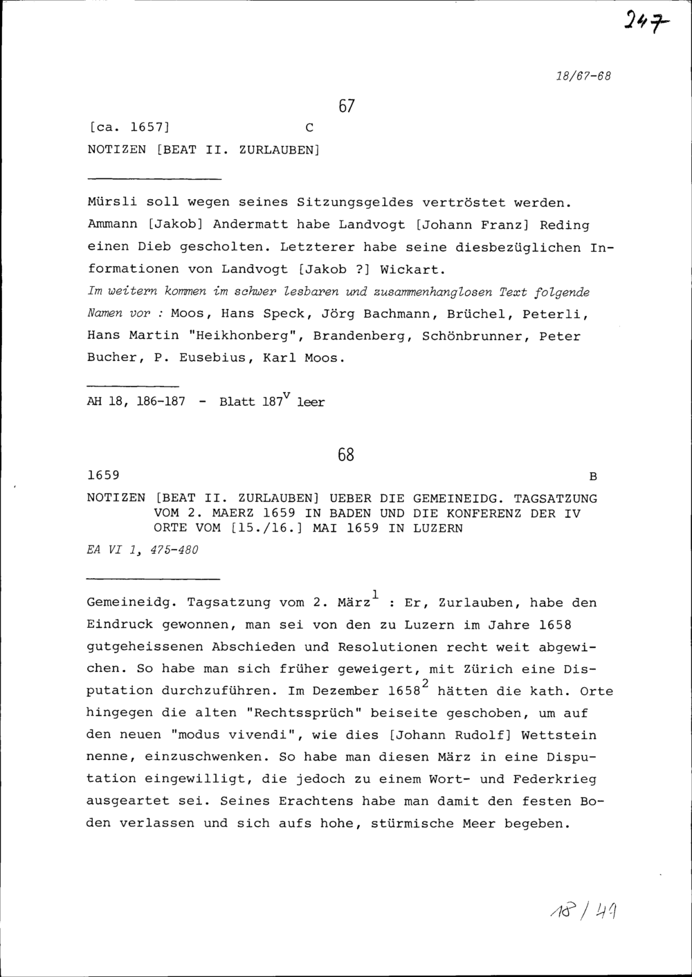 Notiz von Beat II. Zurlauben über die Tagsatzung vom 2. März 1659 in Baden und die...