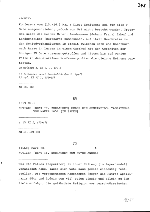 Notiz von Beat II. Zurlauben über die Tagsatzung vom 2. März 1659 in Baden und die Konferenz der Vier Orte vom 15. und 16. Mai 1659 in Luzern