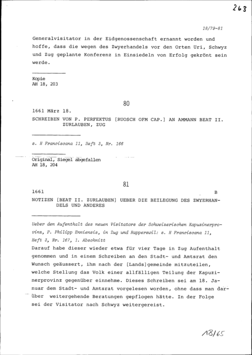 Notiz von Beat II. Zurlauben über die Beilegung des Zwyerhandels und anderes