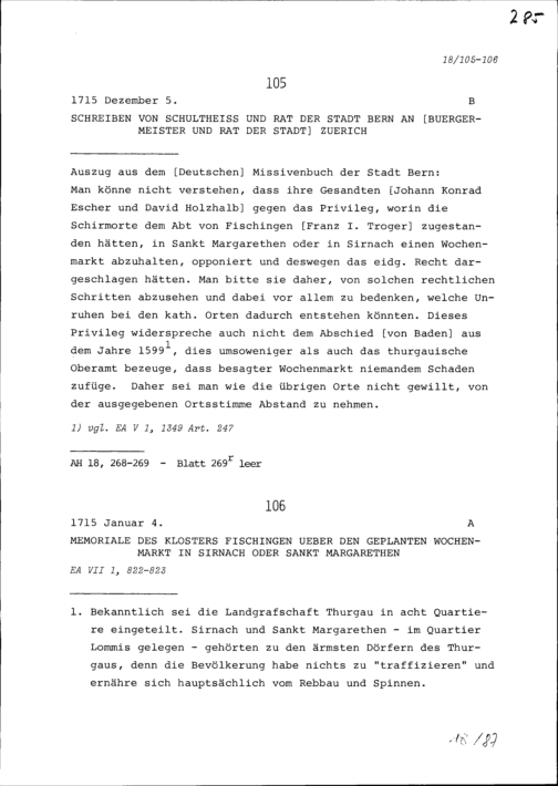 Bericht des Klosters Fischingen über den geplanten Wochenmarkt in Sirnach oder Sankt Margarethen