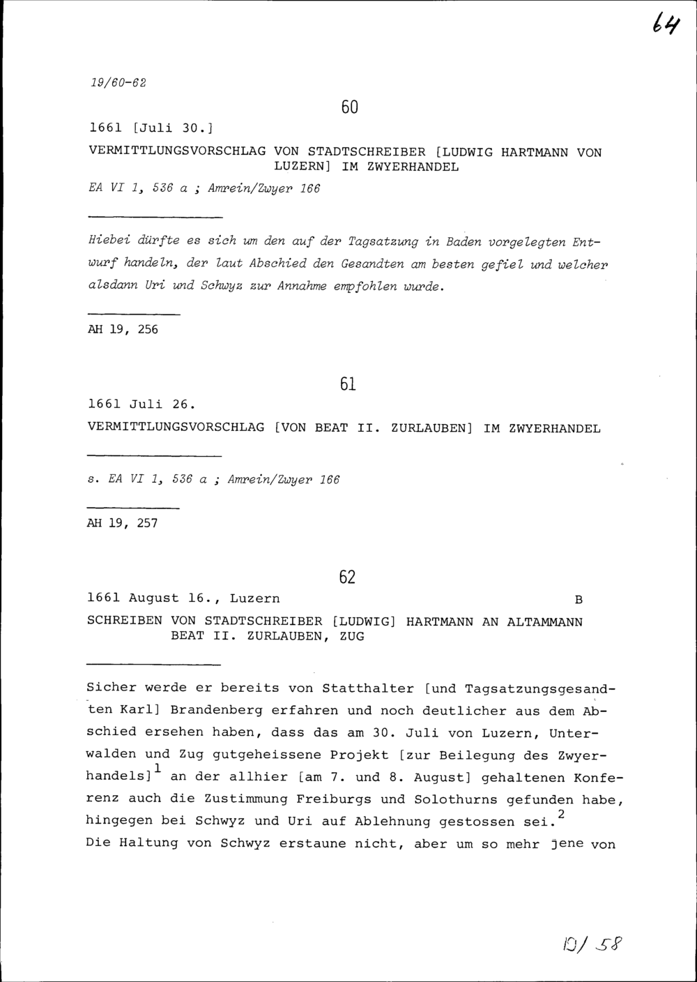 Vermittlungsvorschlag von Beat II. Zurlauben im Zwyerhandel