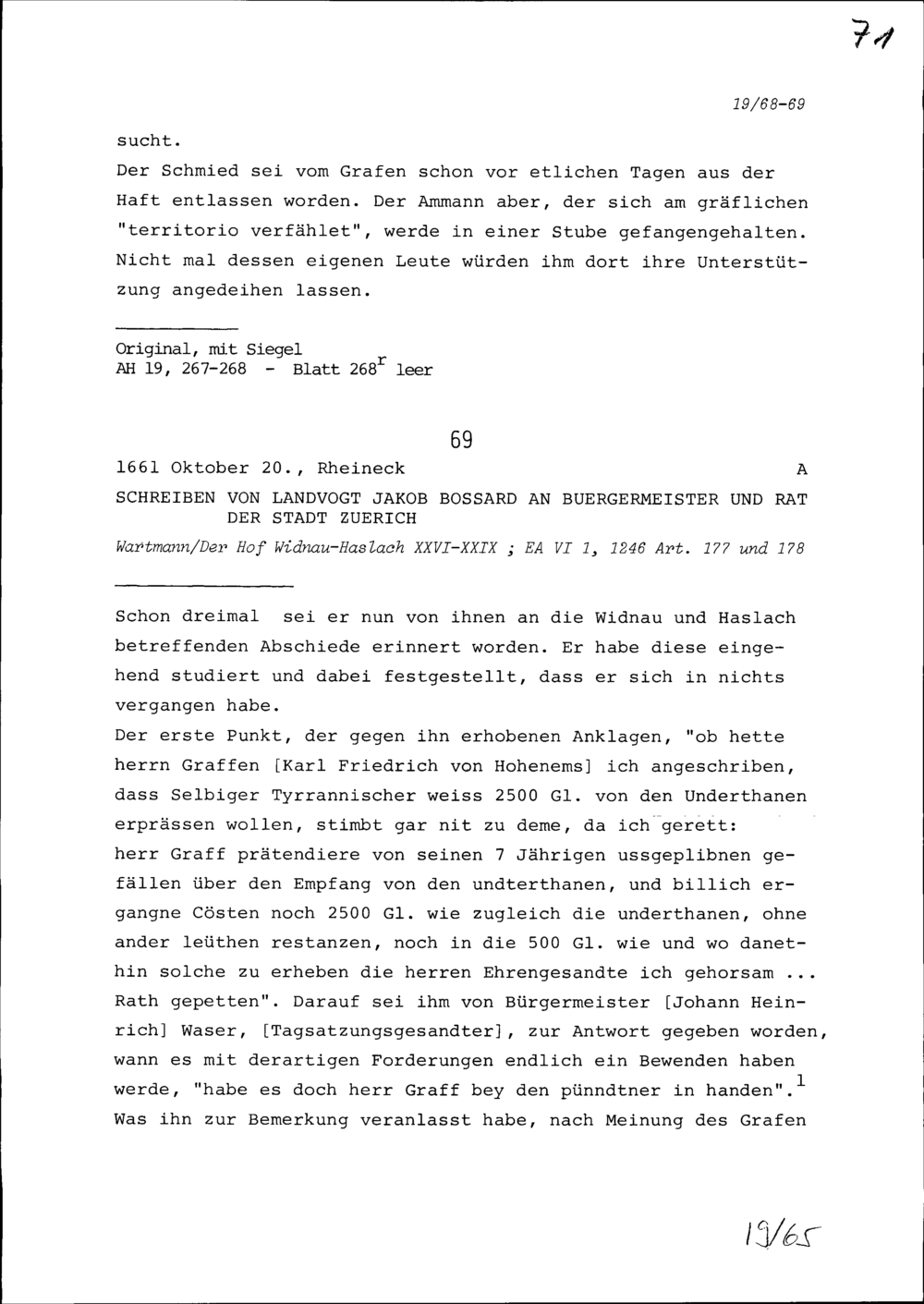 Schreiben von Jakob Bossard, Landvogt, an Ammann und Rat von Stadt und Amt Zug