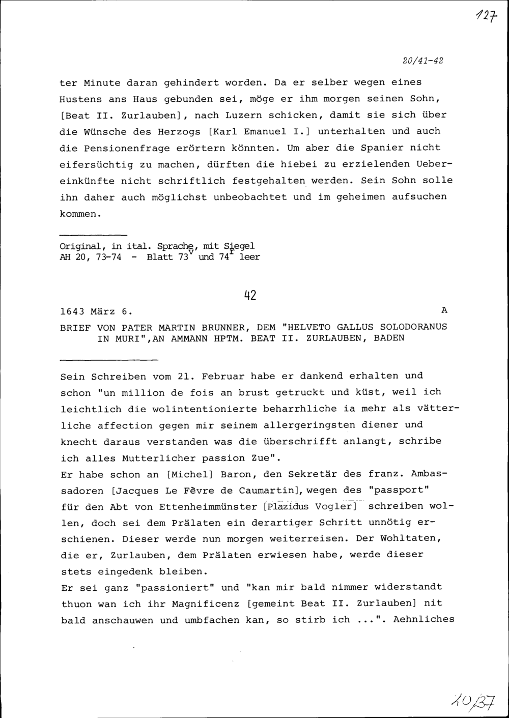 Schreiben von Gian Battista Gabaleon, ausserordentlichen Ambassador von Savoyen, an Konrad III. Zurlauben, Ammann, Zug