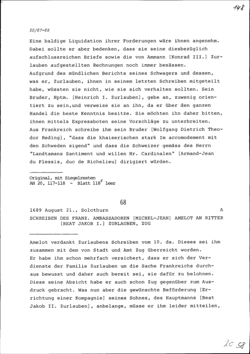 Schreiben von Heinrich Reding an Beat II. Zurlauben, Ammann, Zug