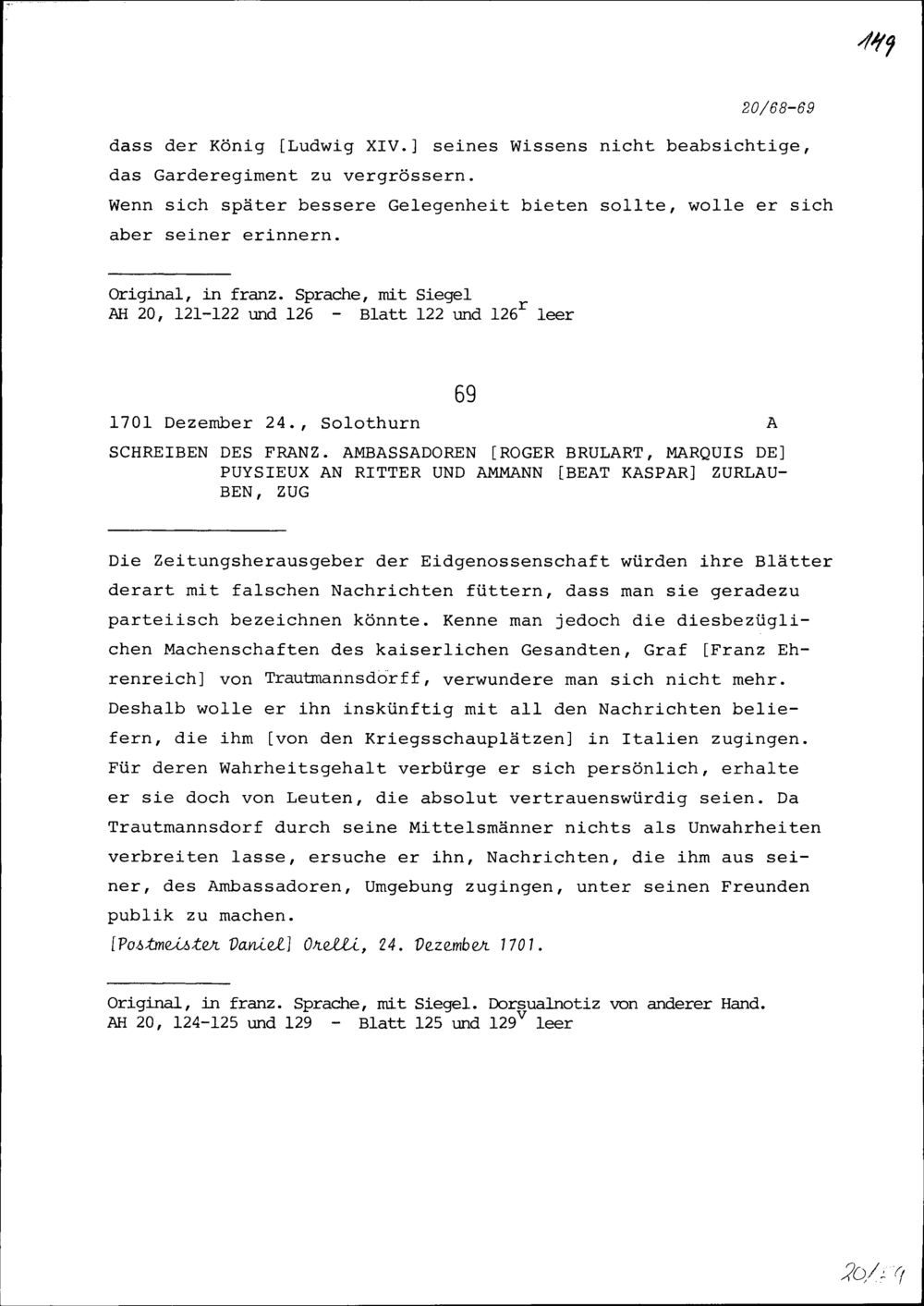 Schreiben von Michel-Jean Amelot, Ambassador von Frankreich, an Beat Jakob I. Zurlauben, Zug