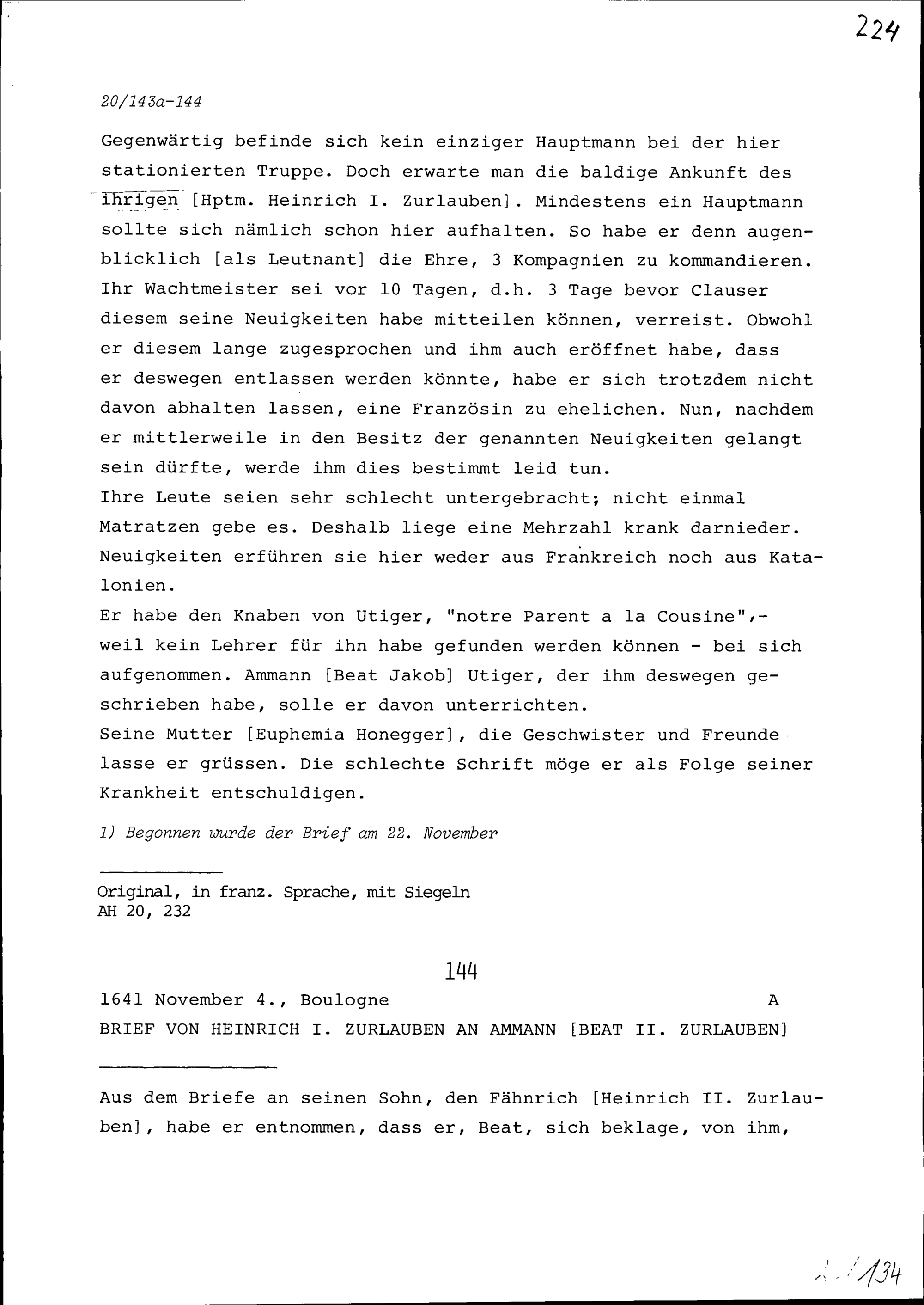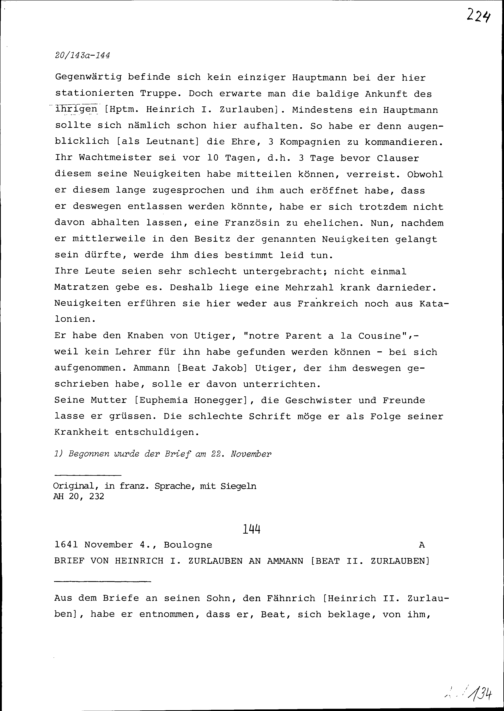 Schreiben von Heinrich II. Zurlauben an Beat II. Zurlauben, Ammann, Zug