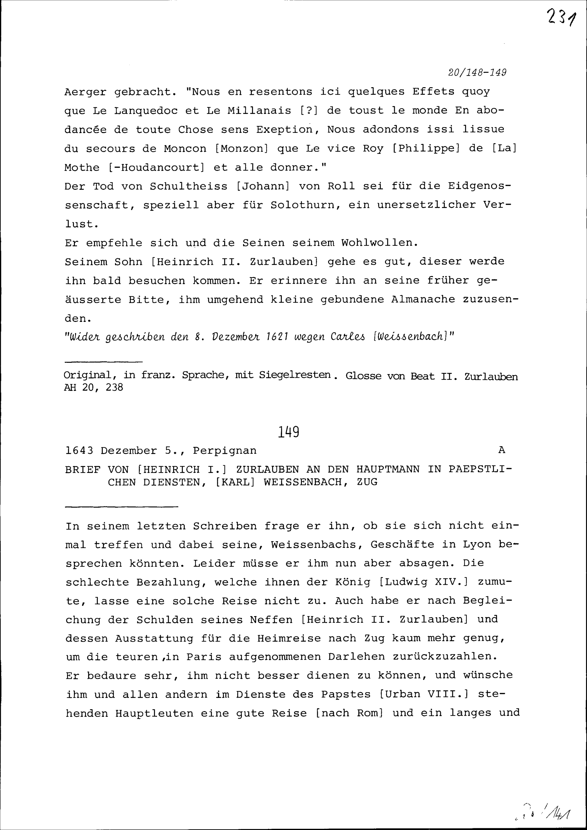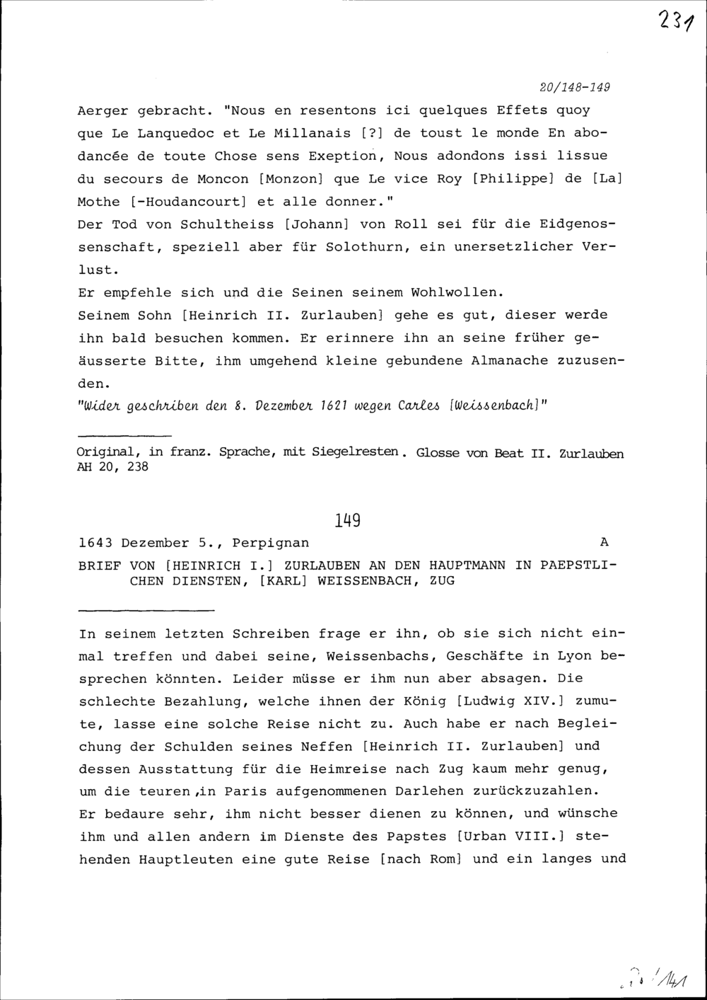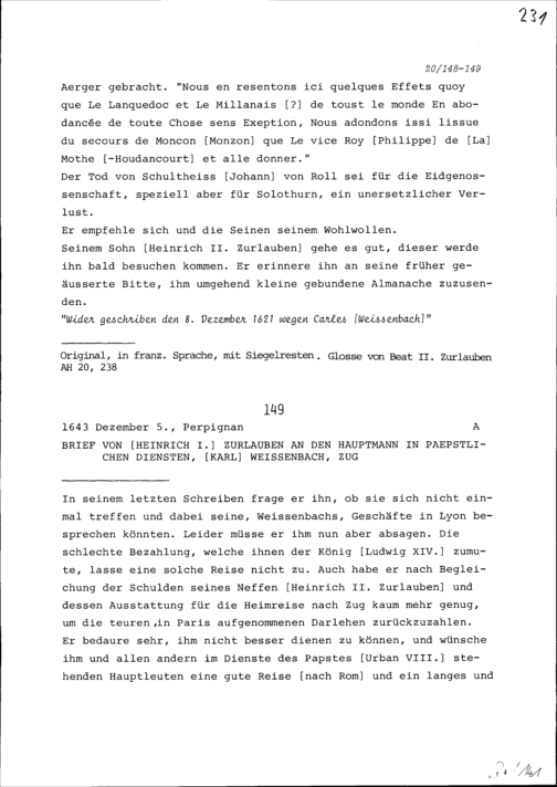 Schreiben von Heinrich I. Zurlauben an Beat II. Zurlauben, Ammann, Zug