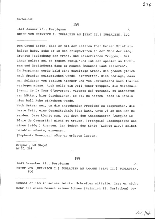 Schreiben von Heinrich I. Zurlauben an Beat II. Zurlauben, Ammann, Zug