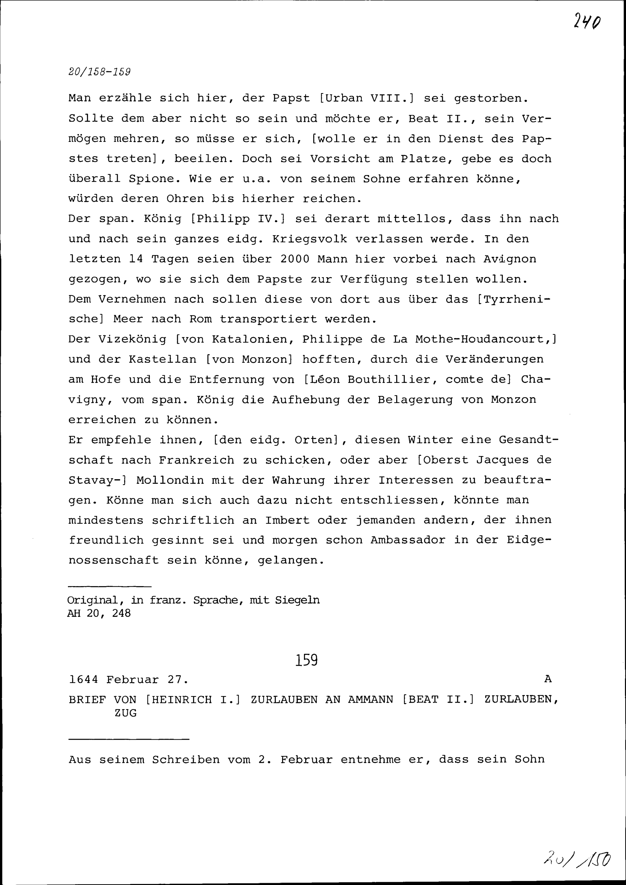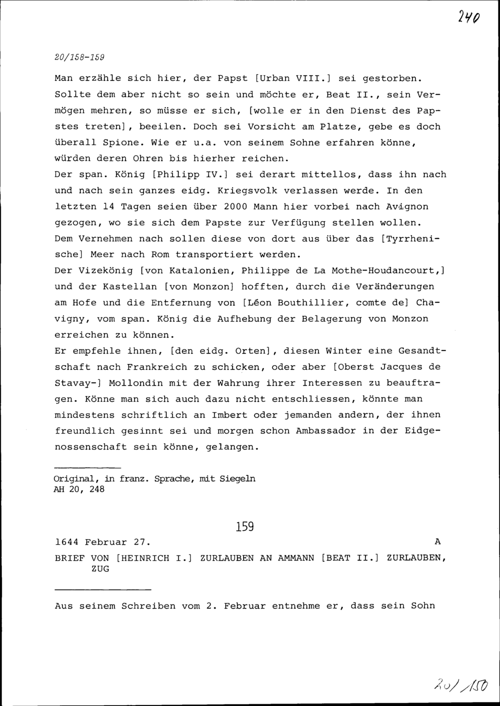 Schreiben von Heinrich I. Zurlauben an Beat II. Zurlauben, Ammann, Zug
