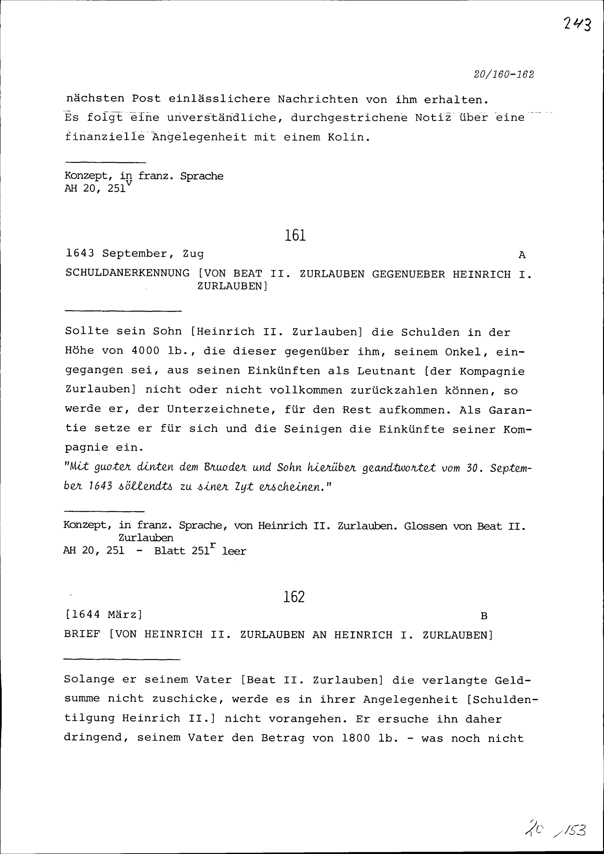 Schreiben von Beat II. Zurlauben an Heinrich I. Zurlauben