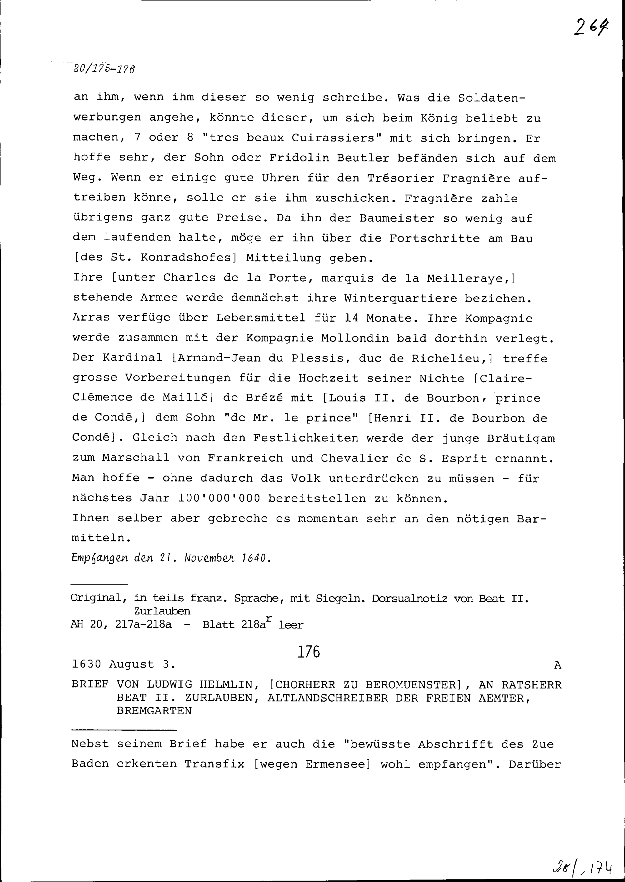 Schreiben von Heinrich I. Zurlauben an Beat II. Zurlauben, Ammann, Zug