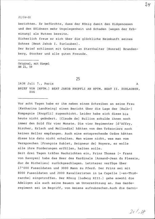 Schreiben von Beat Jakob Knopfli, Hauptmann, an Beat II. Zurlauben, Hauptmann, Z...