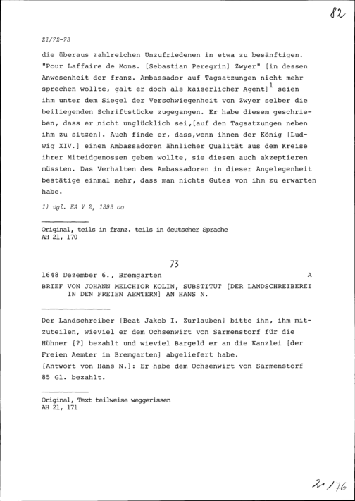 Schreiben von Wolfgang Dietrich Theodor Reding an Beat II. Zurlauben