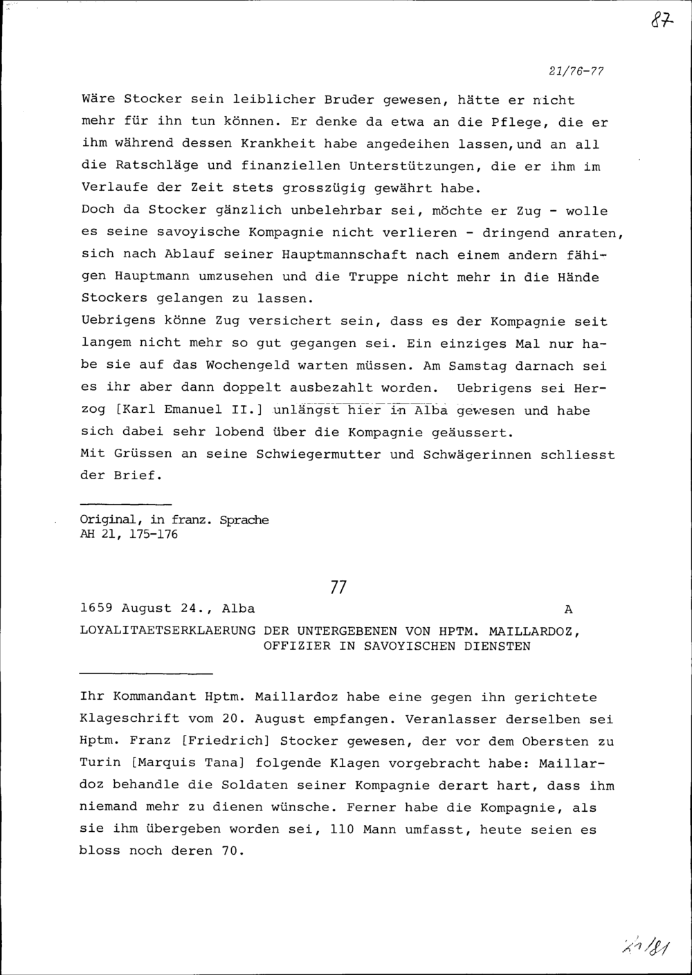 Schreiben von NN Maillardoz, Hauptmann, an Louis du Pré, Hauptmann