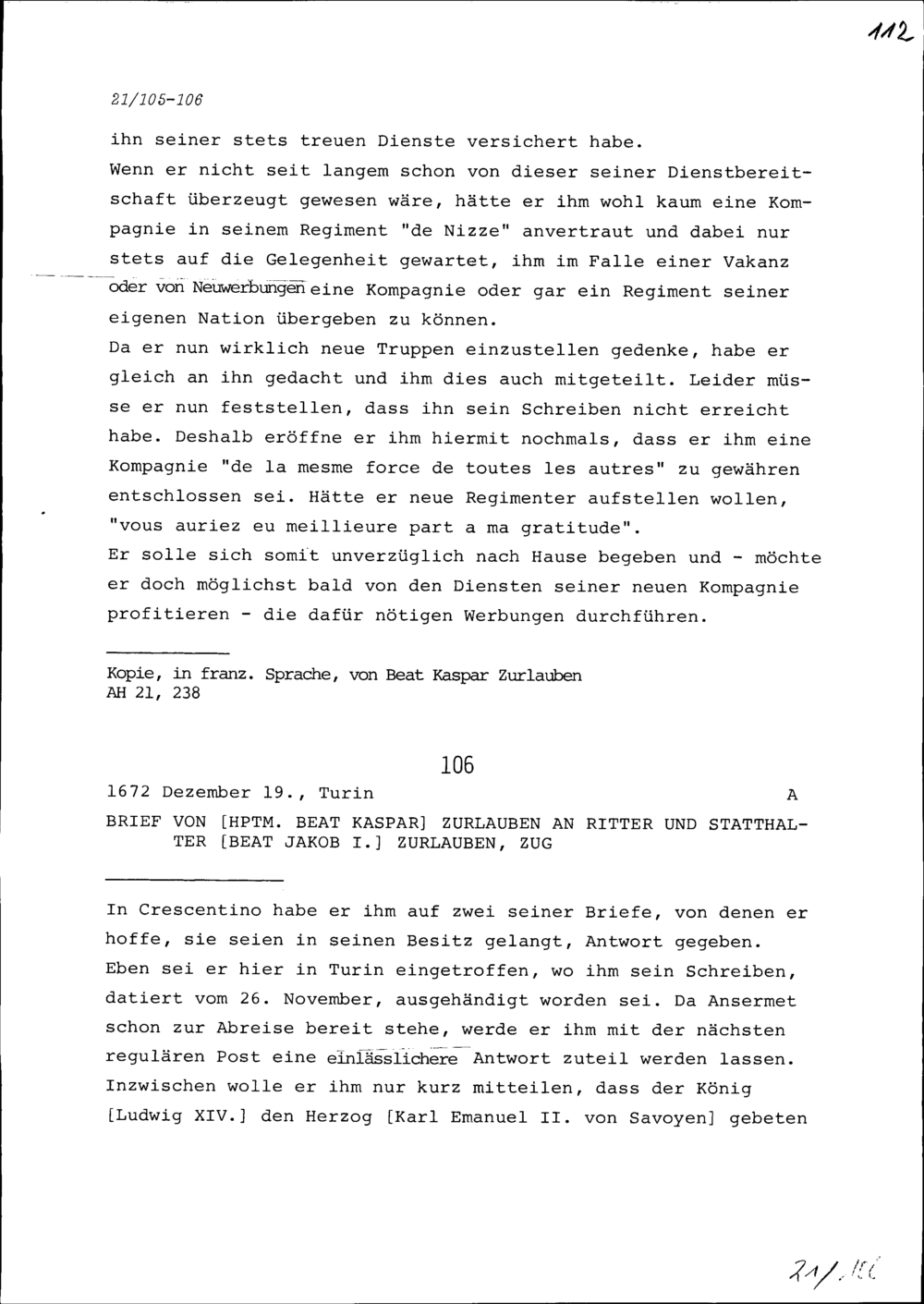 Schreiben von Karl Emanuel II., Herzog von Savoyen, an Beat Kaspar Zurlauben, Hauptmann