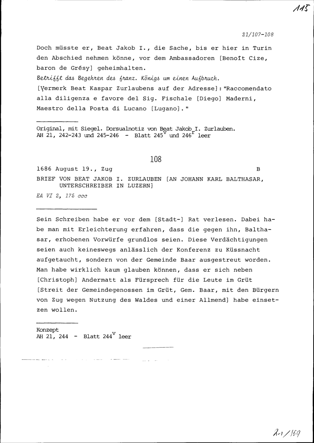 Schreiben von Beat Kaspar Zurlauben an Beat Jakob I. Zurlauben, Statthalter, Zug