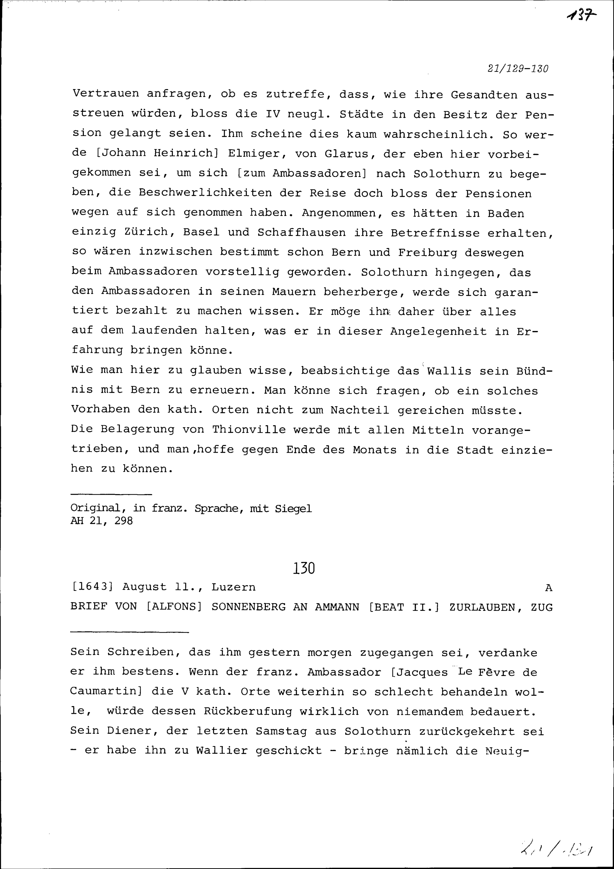 Schreiben von Alfons von Sonnenberg an Beat II. Zurlauben, Ammann, Zug