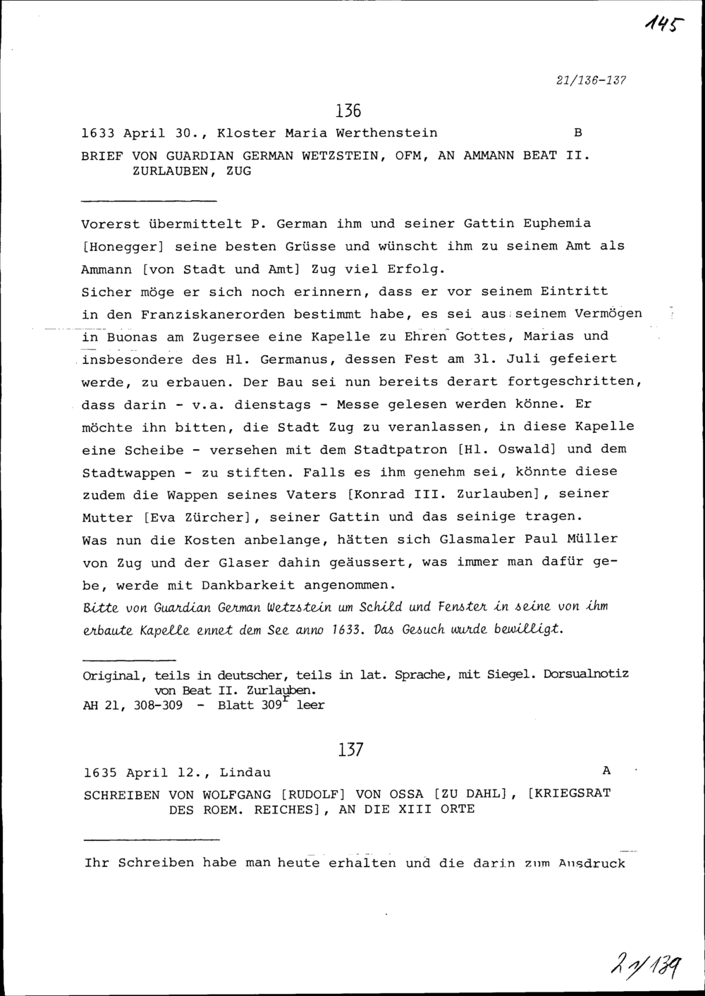 Schreiben von Wolfgang Rudolf von Ossa zu Dahl, Kriegsrat des Römischen Reiches, an die Dreizehn Orte