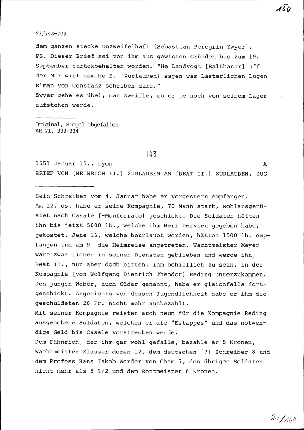 Schreiben von Wolfgang Dietrich Theodor Reding an Beat II. Zurlauben, Zug