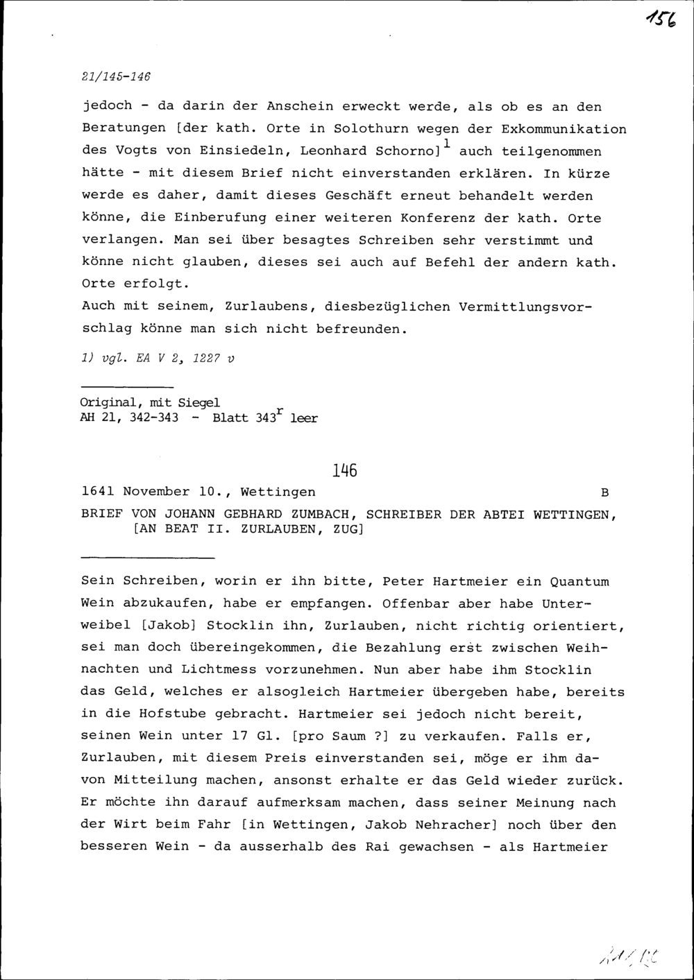 Schreiben von Kaspar Ceberg an Beat II. Zurlauben, Ammann, Zug
