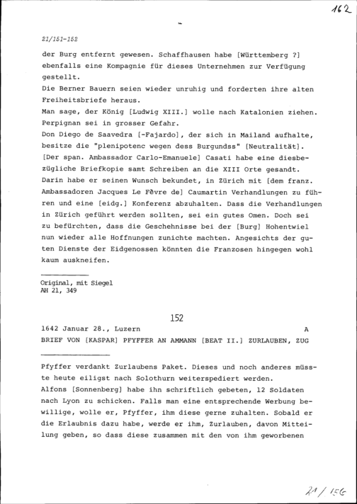 Schreiben von Kaspar Pfyffer, Ratsherr, an Beat II. Zurlauben, Ammann, Zug