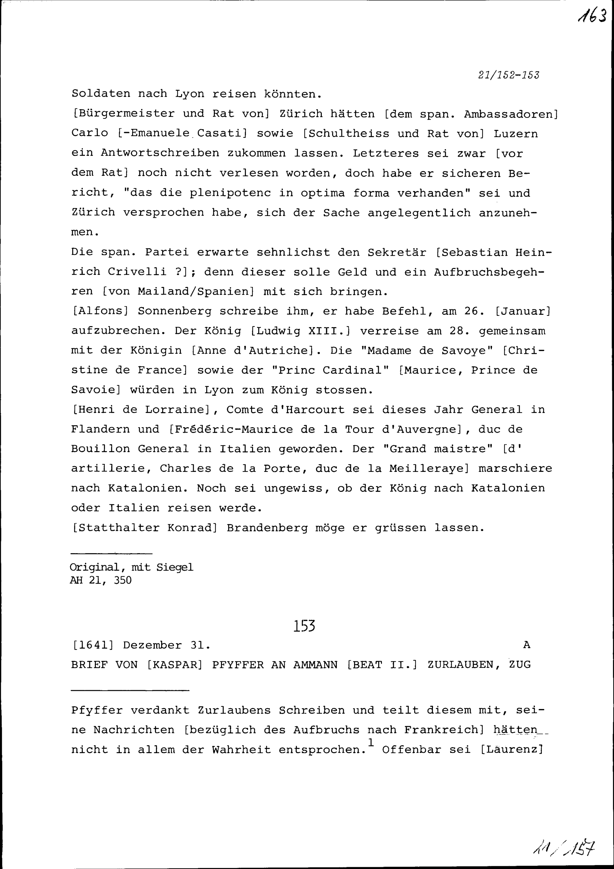 Schreiben von Kaspar Pfyffer an Beat II. Zurlauben, Ammann, Zug
