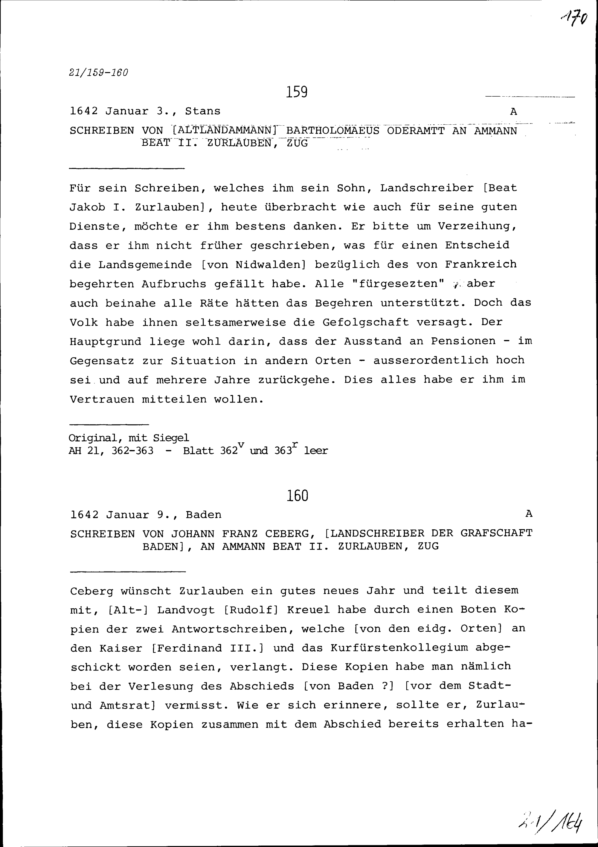 Schreiben von Johann Franz Ceberg, Landschreiber der Grafschaft Baden, an Beat II. Zurlauben, Ammann, Zug
