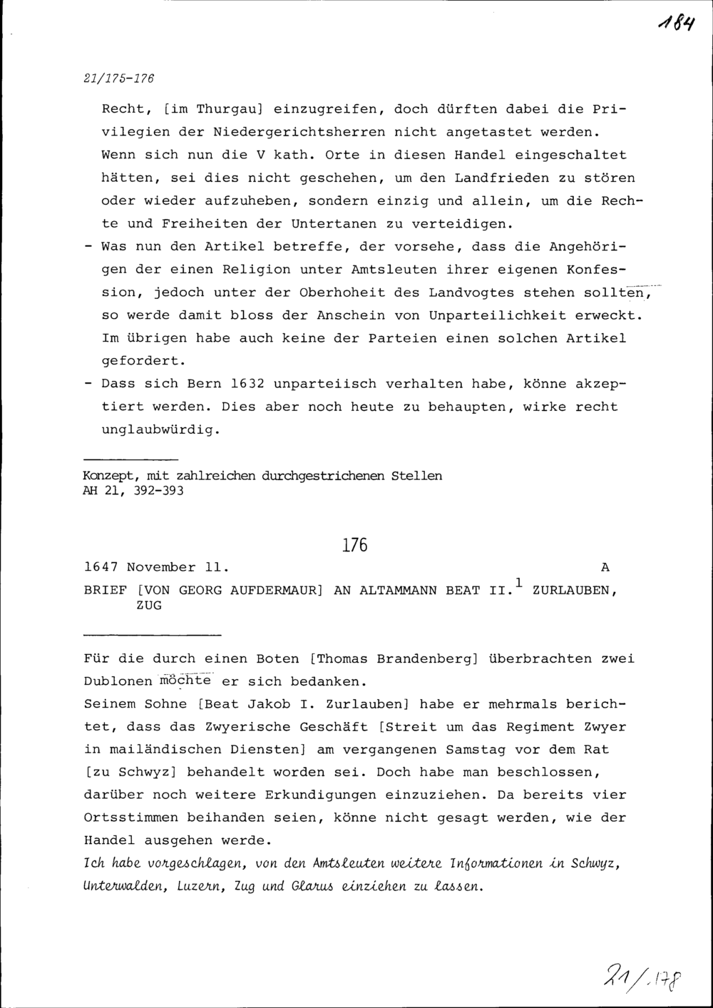Bemerkungen von Beat II. Zurlauben über das Gegenmanifest der beiden neugläubigen Stände Zürich und Bern und das Manifest von Gallus Alt, Abt von Sankt Gallen
