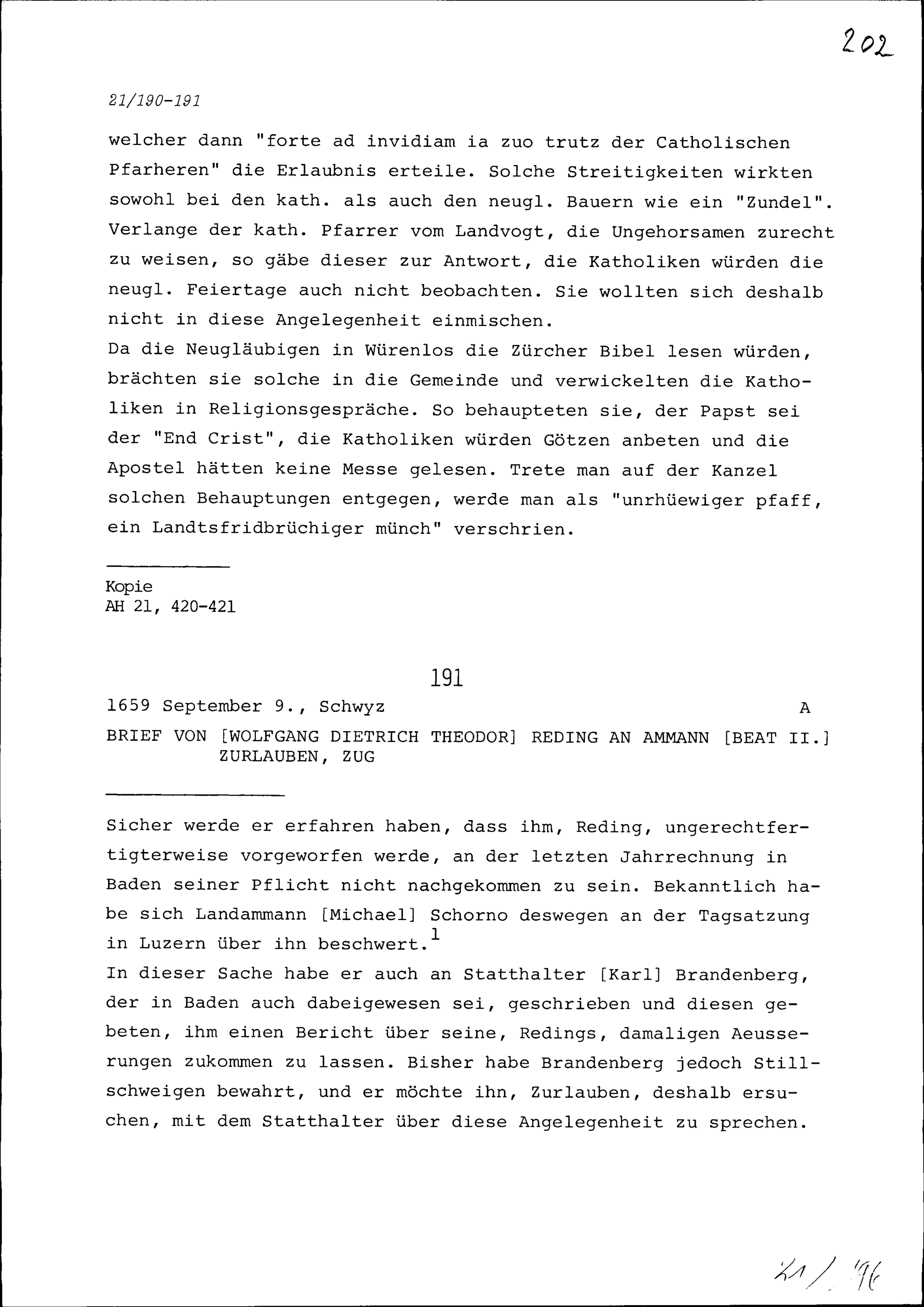 Bericht von Bernhard Keller, Pfarrer, über die Missstände in der Pfarrei Würenlos