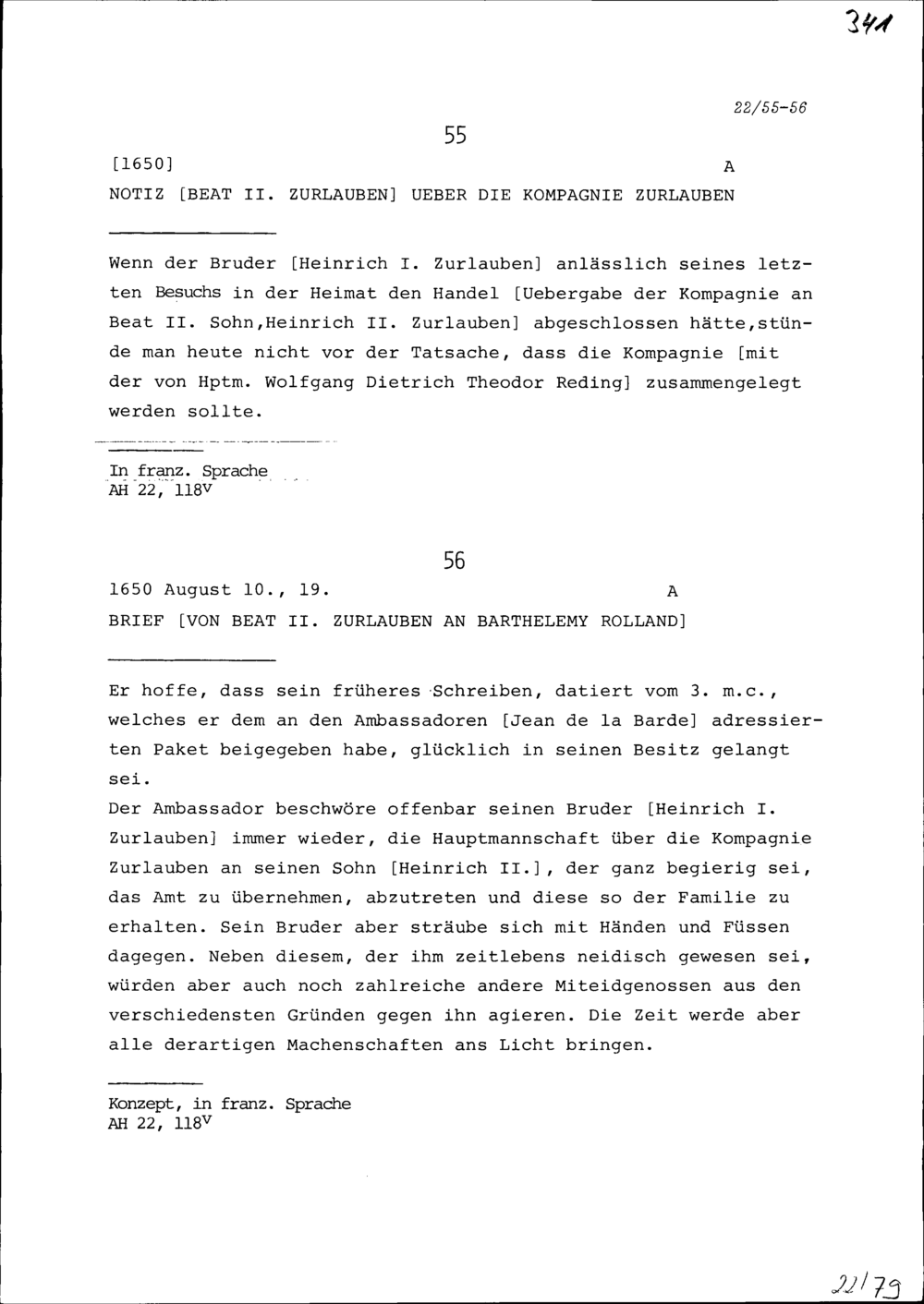 Schreiben von Beat II. Zurlauben an Barthélémy Rolland