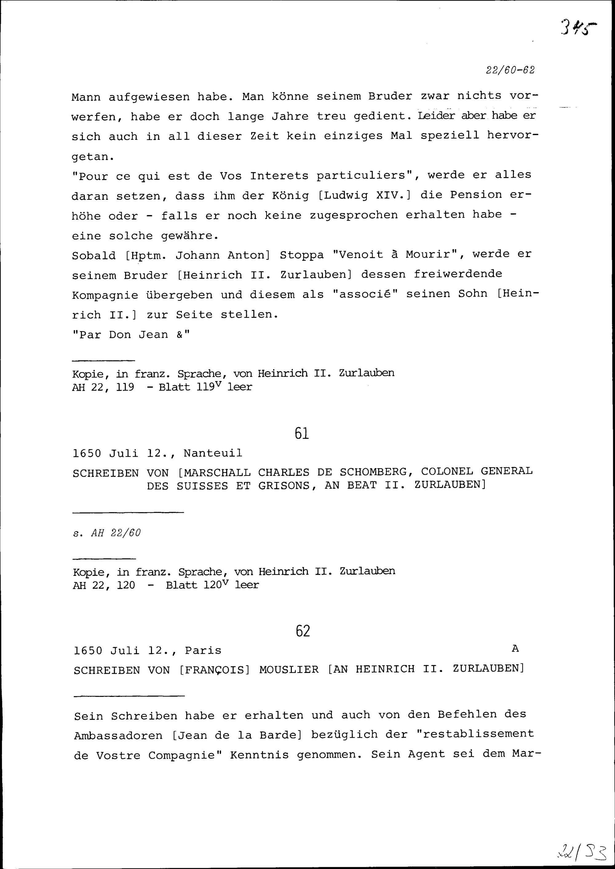 Schreiben von Karl von Schomberg, Marschall und Kommandant des Regiments der Schweizer und Bündner Garden, an Beat II. Zurlauben