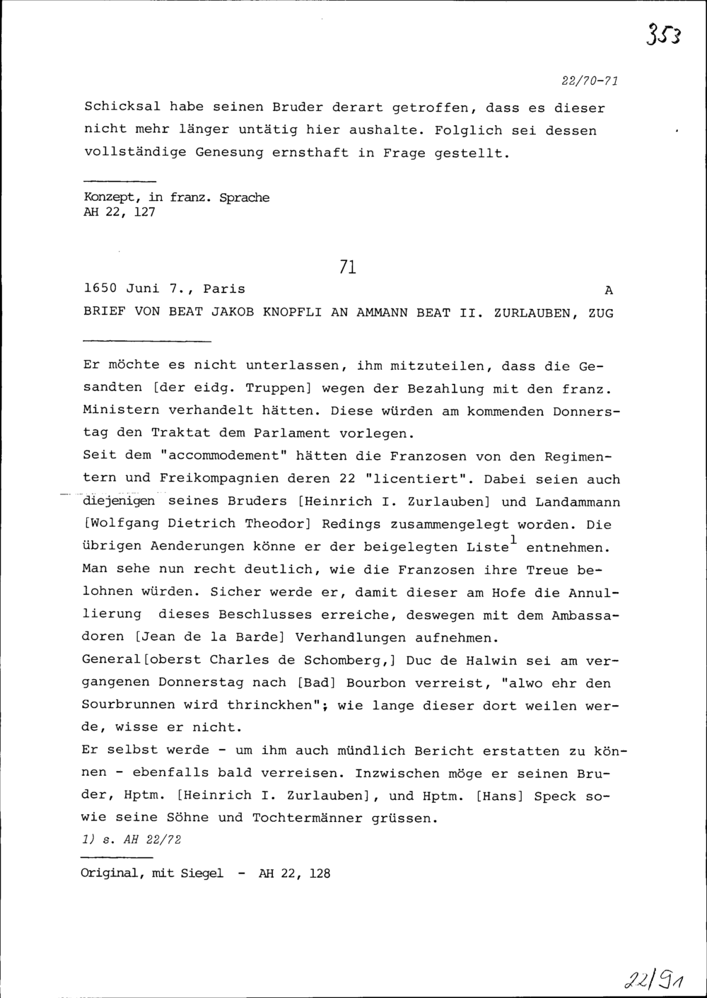 Schreiben von Beat II. Zurlauben an Barthélémy Rolland