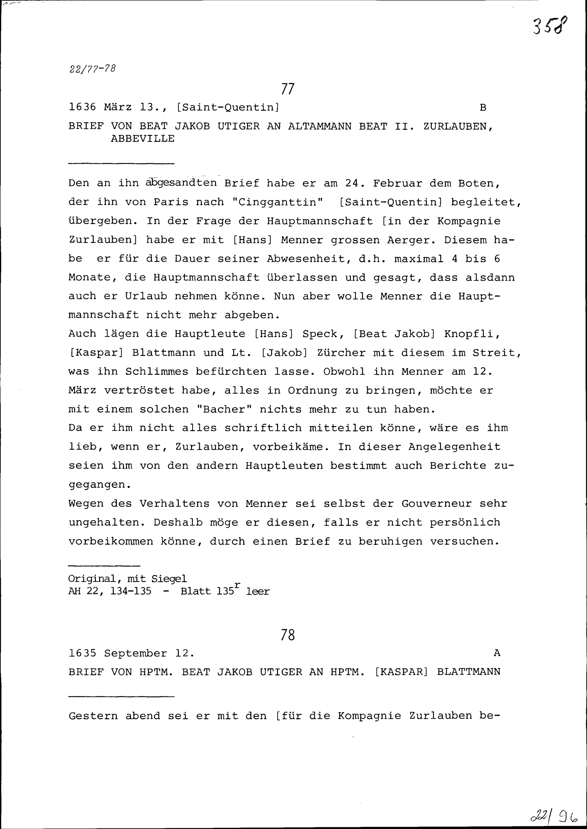 Schreiben von Beat Jakob Utiger, Hauptmann, an Kaspar Blattmann, Hauptmann