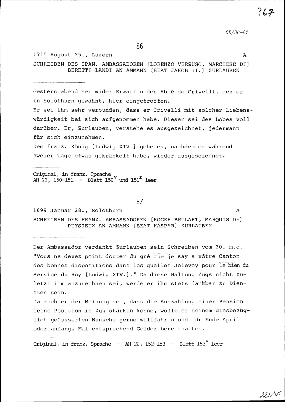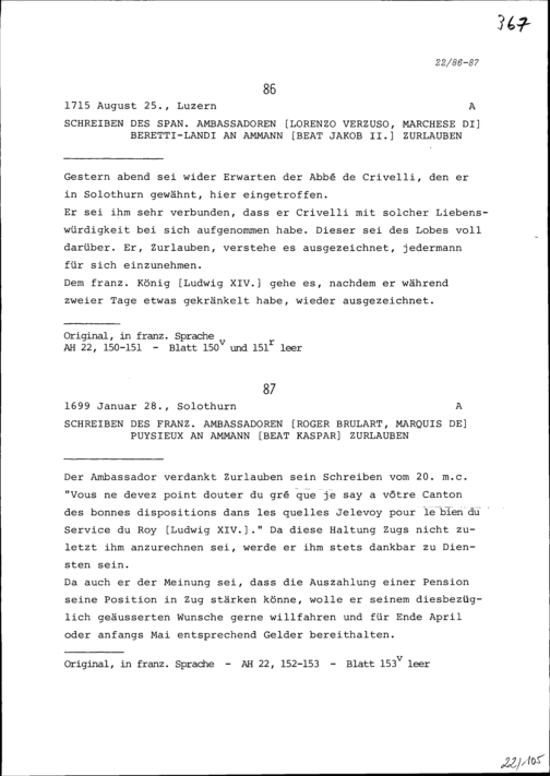 Schreiben von Roger Brûlart, Marquis de Puysieux, Ambassador von Frankreich, an Beat Kaspar Zurlauben, Ammann