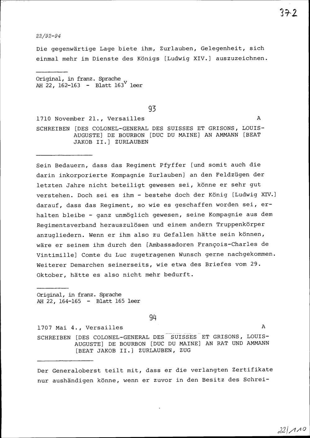 Schreiben von Louis-Auguste de Bourbon, Duc du Maine, Kommandant des Regiments der Schweizer und Bündner Garden, an Beat Jakob II. Zurlauben, Rat und Ammann, Zug