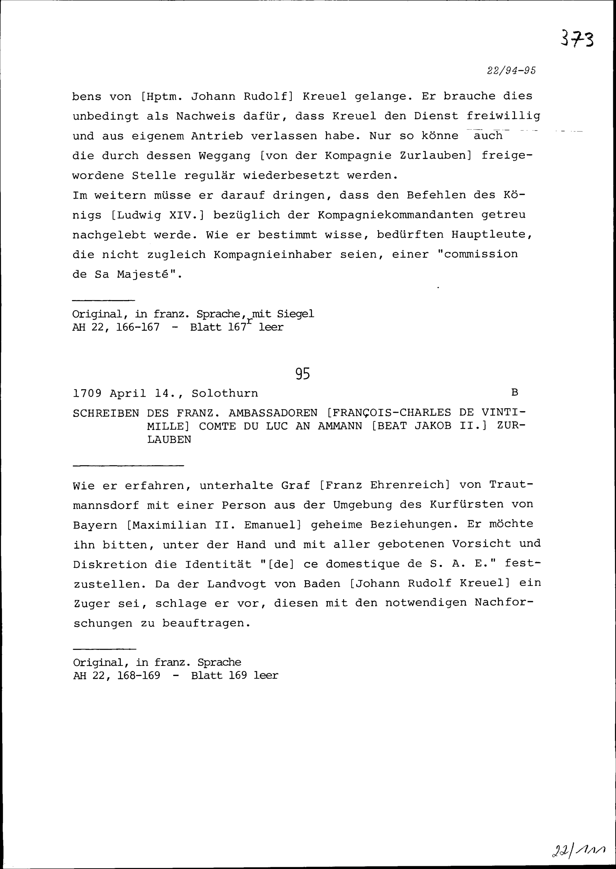 Schreiben von Louis-Auguste de Bourbon, Duc du Maine, Kommandant des Regiments der Schweizer und Bündner Garden, an Beat Jakob II. Zurlauben, Rat und Ammann, Zug