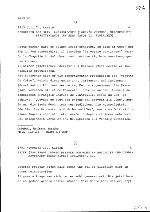 Schreiben von Franz Ludwig Pfyffer von Wyer an Beat Fidel Zurlauben, Brigadier und...