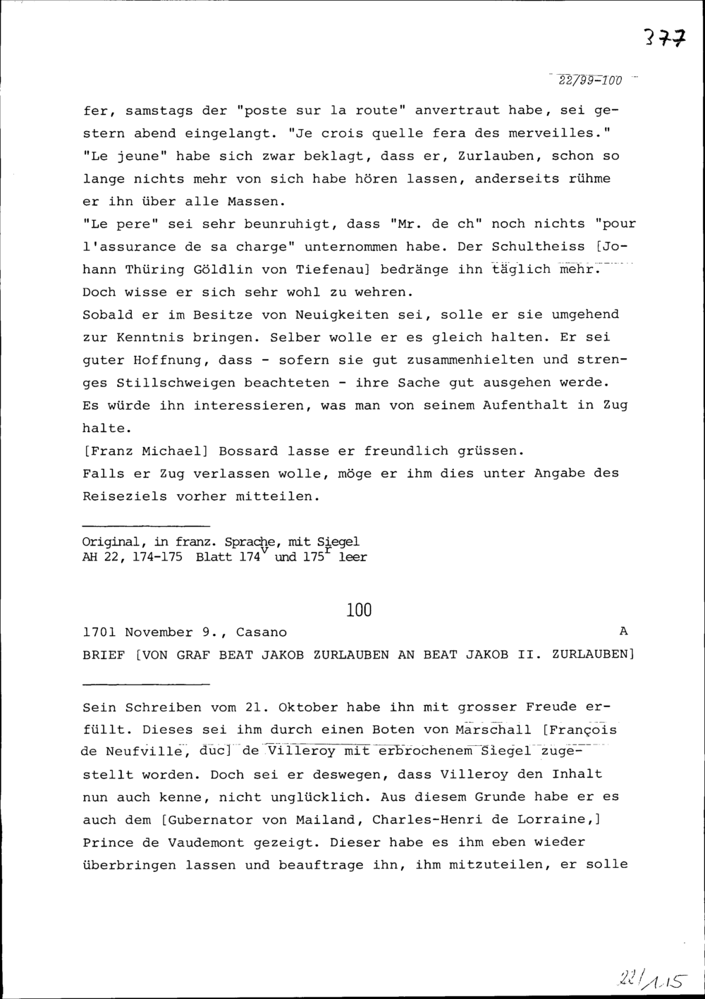 Schreiben von Franz Ludwig Pfyffer von Wyer an Beat Fidel Zurlauben, Brigadier und...
