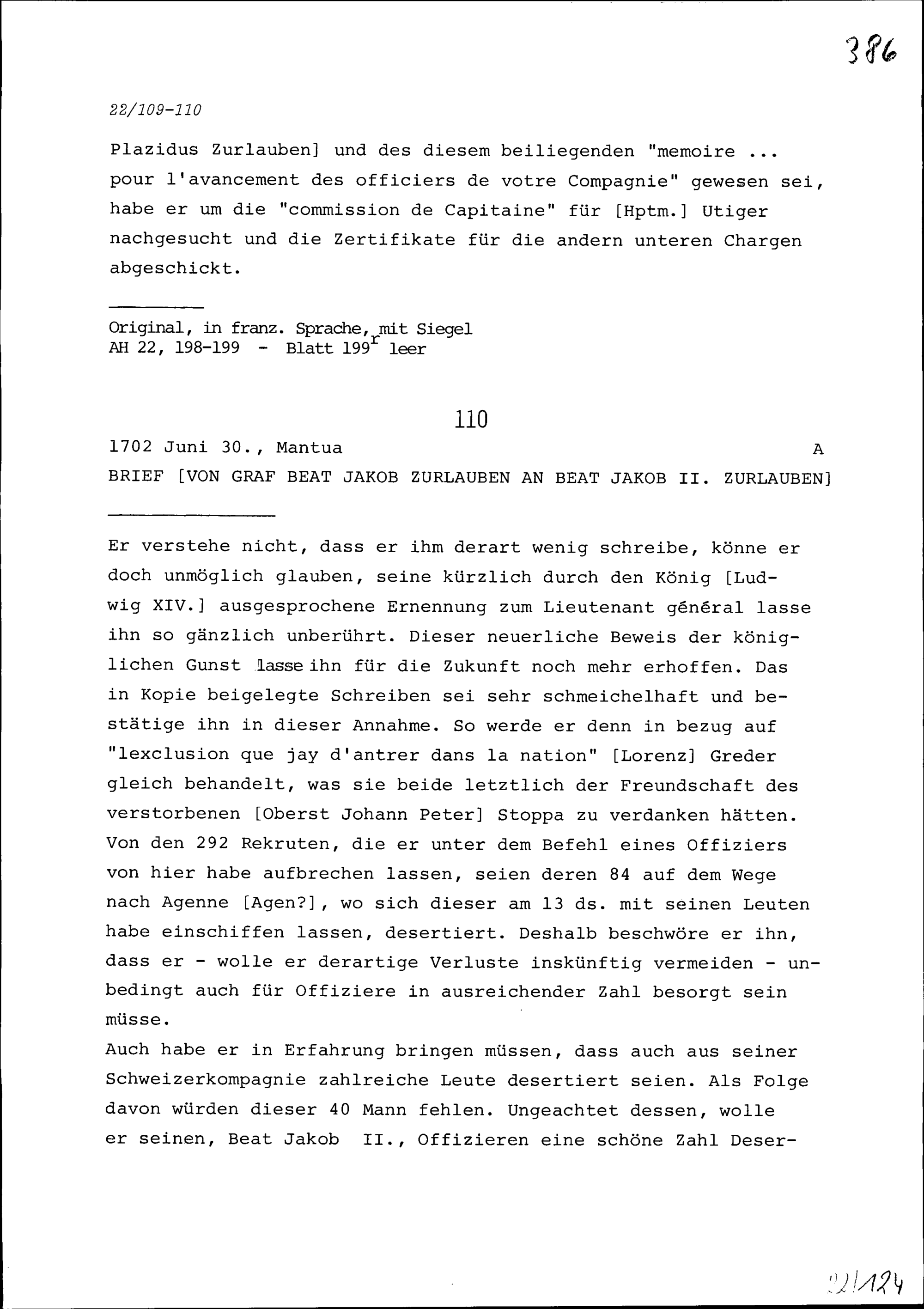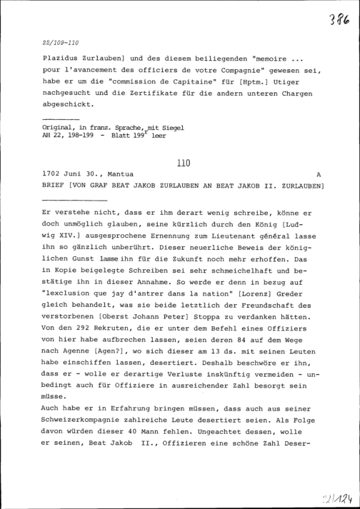 Schreiben von Louis-Auguste de Bourbon, Duc du Maine, Kommandant des Regiments der Schweizer und Bündner Garden, an Beat Jakob II. Zurlauben, Ammann, Zug